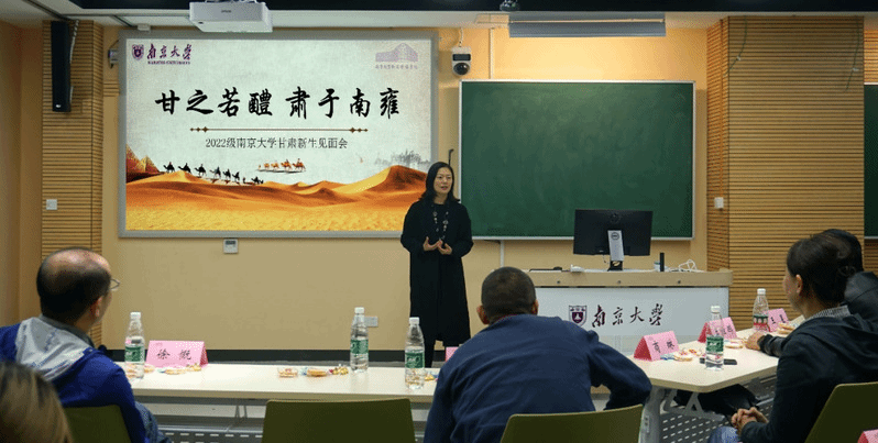 甘肃招生组的老师们也为同学们送上了温情寄语。徐慨老师鼓励同学们以更加开放的心态来面对新的城市、新的学习环境和新的成长路径,在努力进行“学习线”的同时,利用好南大的平台和资源来寻找“职业线”,以此来锚定人生方向,增强精神动力;同为甘肃老乡的商琳老师为同学们分享了在南京可以找到的家乡美味,并从专业角度风趣地讲述了水一定要和电脑分离、重要资料至少应该备份3份等建议;牛克昌老师用家乡方言与大家亲切交流,提醒大家应及时调整心态开启新的学习篇章,既要主动发掘“独特性”,找到自己与众不同的发展路径,也要铭记家乡的精神之根,不能忘本;王蕾老师则叮嘱大家在往前走的同时别忘记关心父母,要常和父母联系,与父母多沟通多交流。