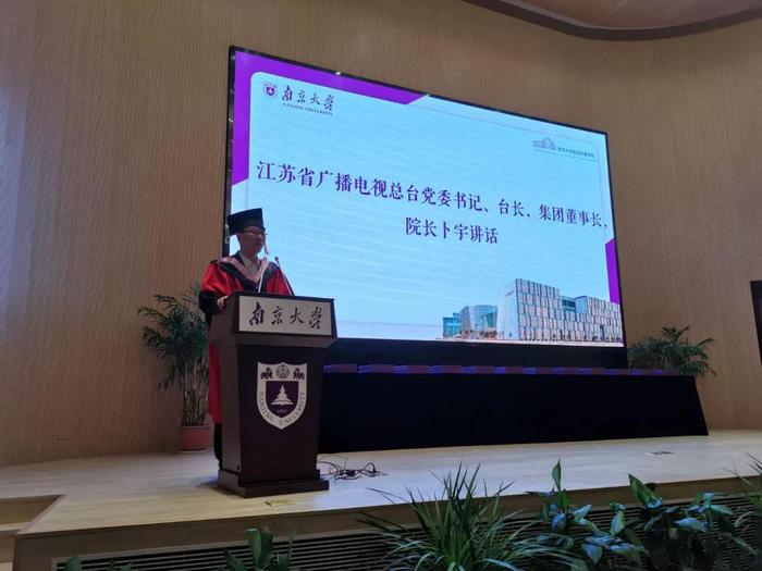 江苏省广播电视总台党委书记、台长、集团董事长,院长卜宇教授讲话,鼓励同学们在未来的人生道路中努力拼搏,奋勇前行。