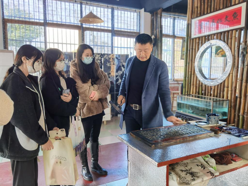 走进驿站,首先映入眼帘的是“鱼文化展列室”,墙面宣传了中国鱼文化的发展历程,展台上陈列了相关鱼文化实物、影像资料等。在李会长的指引下,参观人员逐一观看墙面上的鱼文化宣传画,了解中国鱼文化的发展,学习长江水生物知识。李会长亲自演示了扬州的非遗文化雕版印刷术,拓印的是历史上各大书法大家所写的“鱼”字,字体各异,蕴含着鱼文化千百年间的历史积淀。接着,参观人员亲身体验了一些有趣的鱼文化项目,并在二楼研习室学习了《守护生命的长江》专题讲座。