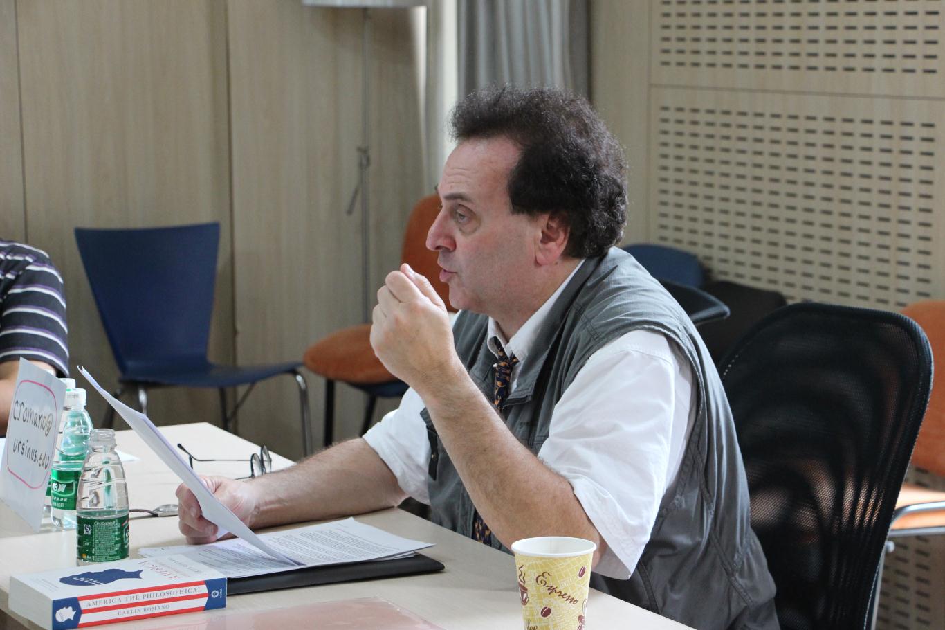 罗马诺教授介绍自己是一位新闻学教授,也是一位哲学教授,专业上的常年积累使他开始思考新闻哲学的问题。讲座伊始,他不断设问:为什么我们需要新闻哲学?不断自我解答:美国的哲学课程中拥有法哲学、人文艺术哲学、科学哲学等分支;不断自我推翻:哲学与新闻学似乎是分属两个维度的学科分类,哲学无法在新闻从业者日常工作和节目制作等过程中具体应用。所以,“既然这样,为什么我们还需要新闻哲学?”罗马诺教授说道。