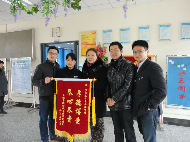 经过两年半的学习,2010级67位研究生于3月底顺利毕业。离校之际,他们向母院,导师,研究生处和学院老师两年多的培养与关心表达了感谢,并向学院赠送了纪念品,向关心他们日常生活的宿管站赠送了锦旗,得到了学院和研究生处领导的高度评价。我们衷心祝愿2010级研究生在工作岗位上不断进步,鹏程万里。