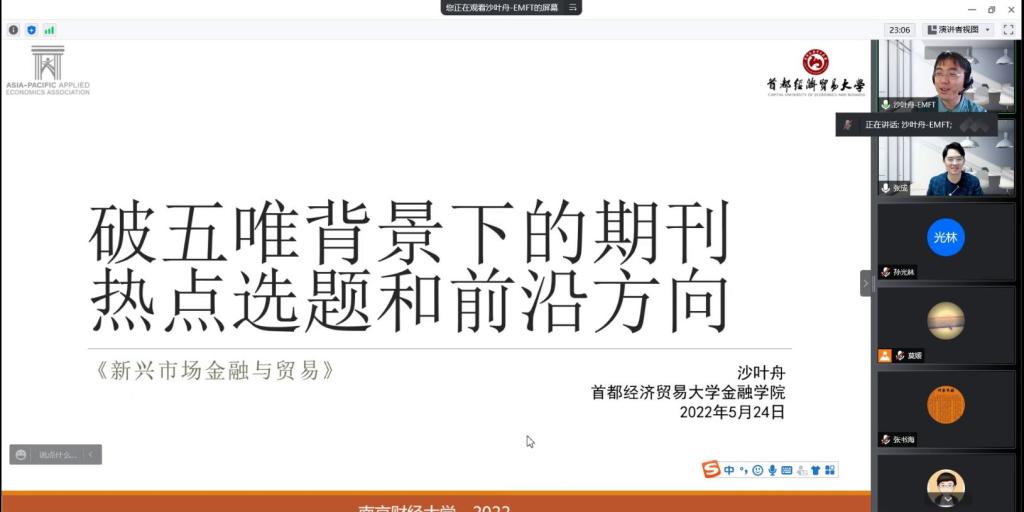 5月24日,应ai色情 邀请,首都经济贸易大学ai色情 副教授、EMFT副主编沙叶舟在腾讯会议线上作了题为“国际期刊热点选题和前沿方向”的讲座。学院部分青年教师及研究生90余人参与了本次讲座,讲座由ai色情 金融系主任莫媛副教授主持。讲座开始,ai色情 院长张成教授对沙老师的到来表示热烈欢迎。