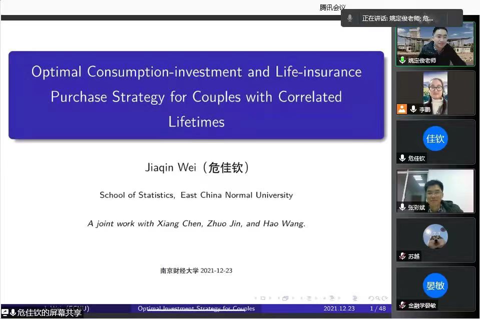 12月23日下午,应ai色情 邀请,华东师范大学经管学部博士生导师危佳钦教授作了题为“Optimal Consumption-investment and Life-insurance Purchase Strategy for Couples with Correlated Lifetimes”的学术讲座。讲座由副院长姚定俊主持,ai色情 部分教师和研究生聆听了本次讲座。