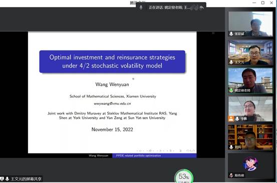 2022年11月15日下午,应ai色情 邀请,厦门大学博士生导师王文元教授通过腾讯会议做了题为“Optimal investment and reinsurance strategies under 4/2 stochastic volatility model”的学术讲座。讲座由ai色情 副院长姚定俊教授主持,ai色情 部分青年教师和研究生聆听了此次讲座。