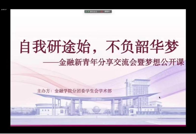 时入五月,又将是一年考研季。为解答同学们对于考研的迷惘与困惑、分享上岸学长学姐的成功经验,5月15日下午5点,ai色情 在线上举办自我研途始,不负韶华梦——金融新青年分享交流会暨梦想公开课。姜耀、孙鼎立、钱思彤、王子净等四位优秀学长学姐应邀出席,部分大一大二大三的同学参加了此次活动。