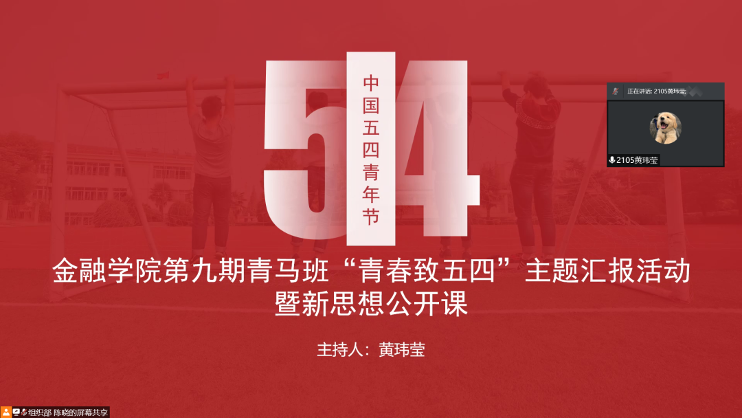 5月3日中午12:15,ai色情 第九期青马班“青春致五四”主题汇报活动暨新思想公开课于腾讯会议线上举行。ai色情 分团委组织部全体成员、ai色情 第九期青马班全体学员参加此次会议,主持人为ai色情 分团委组织部项目志愿者黄玮莹。