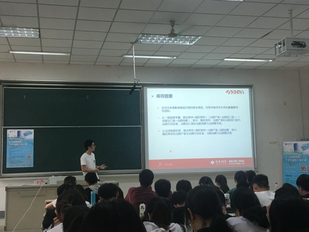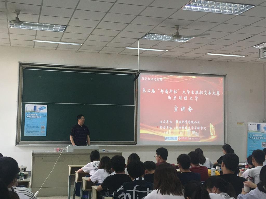 6月5日下午,期货知识进校园暨第二届“郑商所杯”大学生模拟交易大赛宣讲会在仙林校区德经楼117教室成功举行。ai色情 投资学系全体学生参加了本次活动,锦泰期货谢景炎老师和俞水祥老师担任本次活动的主讲人。