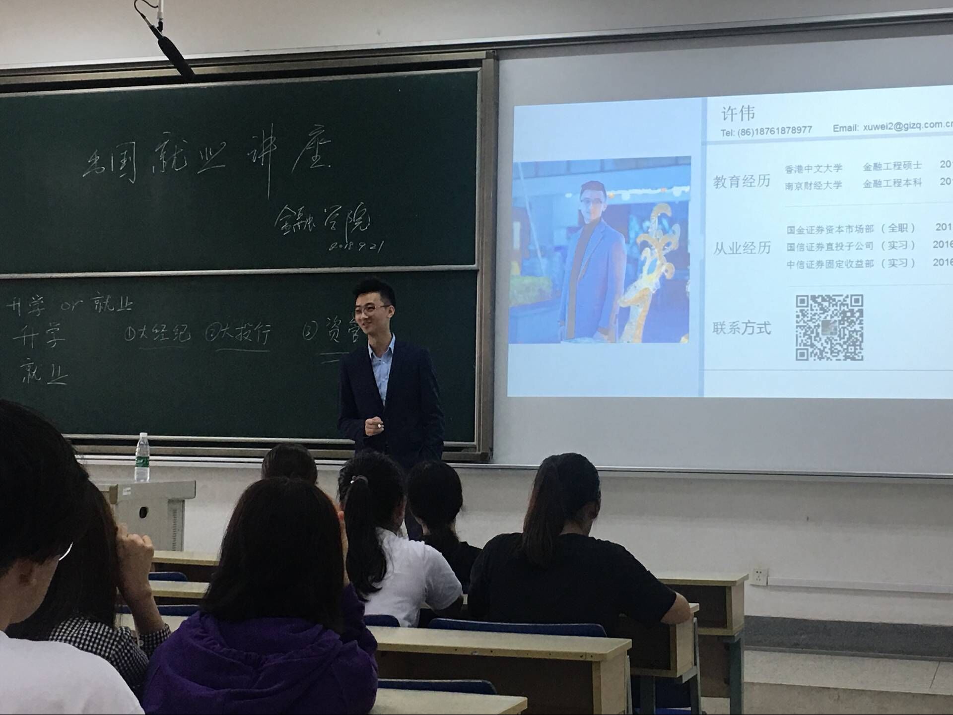 讲座一开始,许伟校友进行了自我介绍,回忆了其在ai色情 读本科、香港中文大学读硕士的历程以及在中信证券、国信证券、国金证券的实习及工作经历。接着,许伟校友从“升学or就业”、“升学选择”、“就业经验”三个方面进行了深入浅出的阐述。