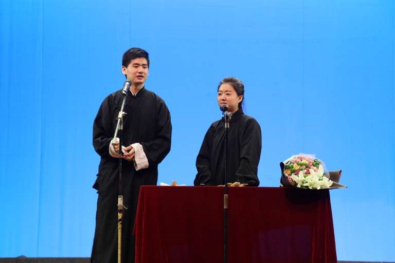 6点左右,观众陆续进入礼堂,礼堂入口处不断有人来领取抽奖号码牌。相声社老人、河海大学、南广学院等高校联盟的成员们以及我校众多社团组织的同仁们也纷纷来到了现场。半小时后,在大家的热烈期盼下专场演出正式开始。首先为大家献上的是潘老师和冯老师的开场小唱《楚汉相争》,他们用歌声调动起了现场的气氛,也点燃了观众的热情!接下来就是由冯若晨、邢嘉成带来的《爱情传奇》,两个人一逗一捧,台下笑声掌声连成一片。紧接着就是潘老师和张革表演的《一言不合就穿越》,老司机潘老师一路开车,小部员张革也毫不羞涩,表演精彩到位,观众无不喜笑开怀。郑老师和周有颜带着备受观众期待的相声《量子力学与广义相对论在相声表演与创作中的指导与运用》上台了,搞笑夸张的动作,台上台下的互动,都引得观众欢呼鼓掌,堪称整场演出的高潮!接下来是群口相声《红花绿叶》,表演者史裕安、孙诗慧、姚亚东、谭媛媛,用嬉笑怒骂演绎相声中的捧逗之争,骂到浓时自然打,看得人忍俊不禁。在大家的热烈期待中压轴大戏来啦,由杨家宇、石悦带来的《对春联》一个个稀奇古怪的对子让春联变得雅俗共赏,二人相互开撕引来观众连连叫好,即使节目接近尾声,即使时间已经临近九点,现场依旧火爆。在这样热烈欢乐的气氛中我们的专场圆满结束。演出结束后,逗你玩儿相声社全体成员以及高校联盟上台合影留念,热烈祝贺第六届“相由心声—薪火相传”相声专场演出圆满成功!