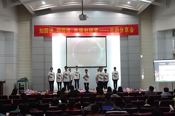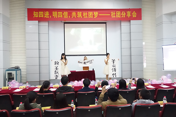 11月7日晚6:30,由ai色情 学生会社团办公室主办的“知四进,明四信,共筑社团梦——社团分享会”活动在经济学科楼双登报告厅隆重举行。校学生会常务副主席周健文、校学生会常务副主席纪晓倩、社团联合会主席吴明雪、宿舍管理委员会会长李芝芳、ai色情 学生会主席曹翔宇、ai色情 学生会执行主席刘晗、ai色情 学生会副主席许雪娇等嘉宾参加了分享会,与同学们一起感知四进四信,欢度美好时光。