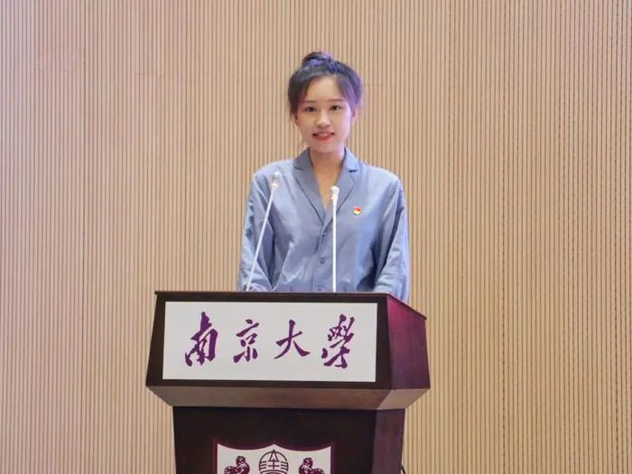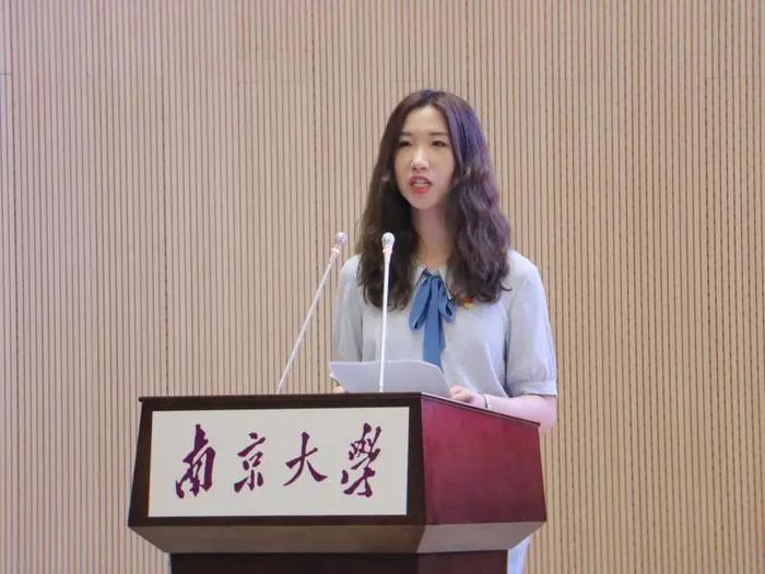 毕业生党员代表时轶楠回顾了个人在南大新传的成长旅程,号召各位毕业生党员在将来社会中的坚定理想信念,践行初心使命。
