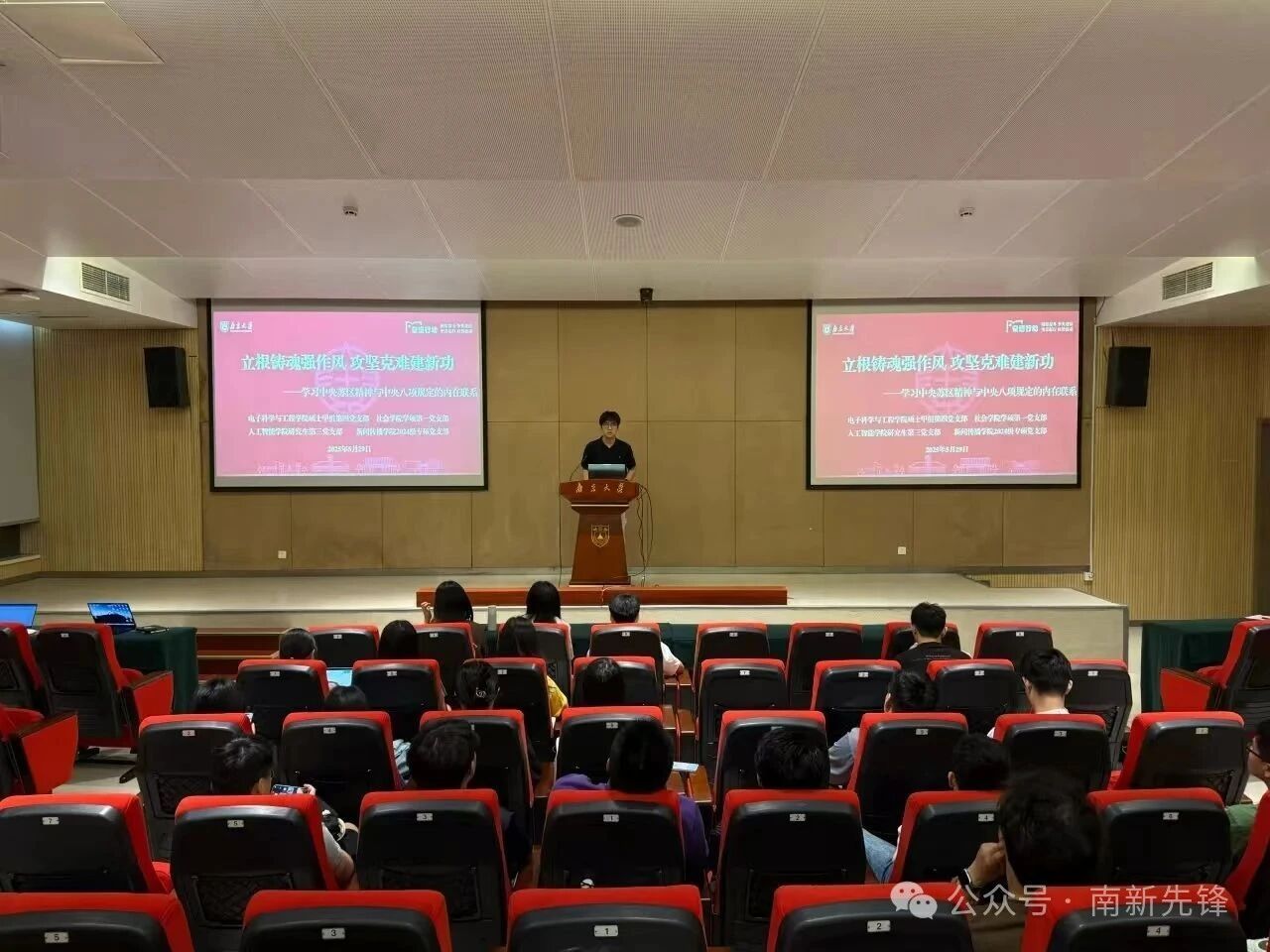 、电子科学与工程学院、社会学院和人工智能学院的四名研究生党建骨干“先锋计划”第二期的学员共同组织策划,以5月上旬参加“先锋计划”赴江西瑞金红色教育实训活动的所见所闻、深入贯彻中央八项规定精神学习教育感悟为主要内容,展开主题党日分享。