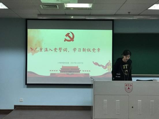 “《中国共产党章程》在中国共产党第_____次全国代表大会部分修改,2017年10月24日通过。”支部书记聂思宇声音刚落,潘培同学就高高的举起了手并给出了正确答案。其他同学也不甘落后,整个活动在积极的氛围中进行。