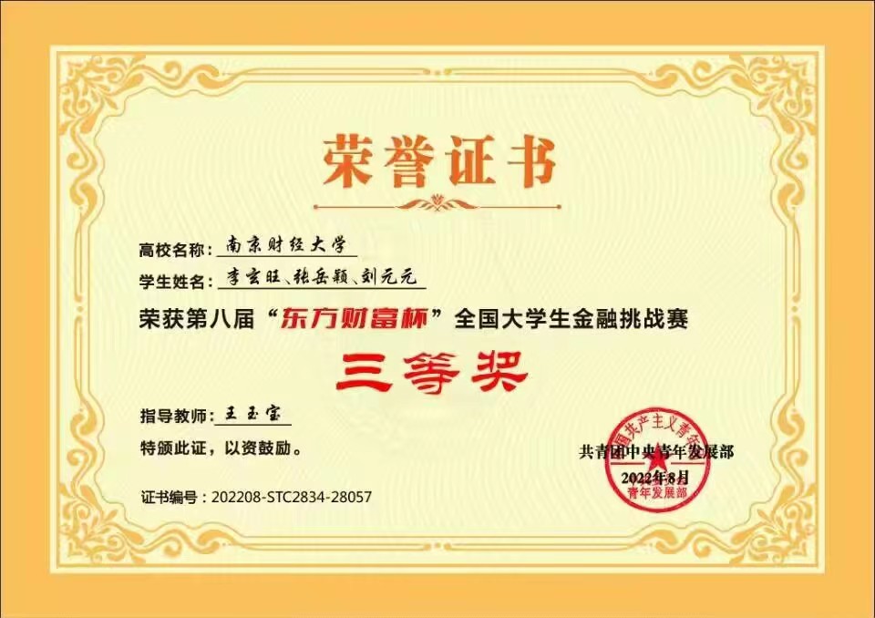 2月27日,由团中央青年发展部主办,全国学校共青团研究中心、东方财富信息股份有限公司和中央财经大学承办的第八届“东方财富杯”全国大学生金融挑战赛圆满结束。我校ai色情 学子获江苏省二等奖、全国三等奖。