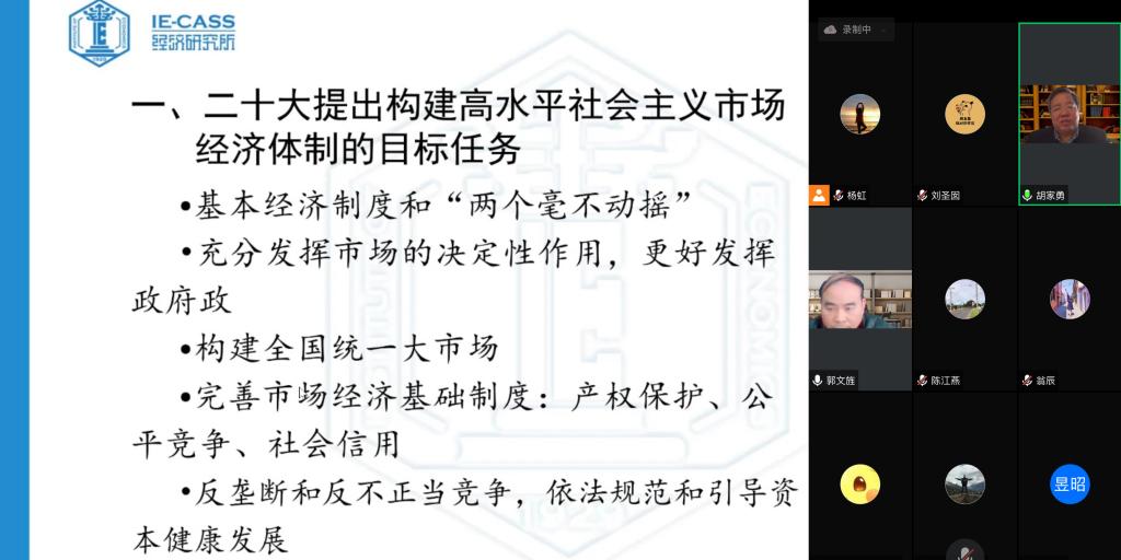 12月5日下午,应ai色情 邀请,中国社会科学院胡家勇教授作了题为“构建高水平社会主义市场经济体制”的线上讲座。讲座由学院副院长郭文旌教授主持,学院青年教师聆听了讲座。
