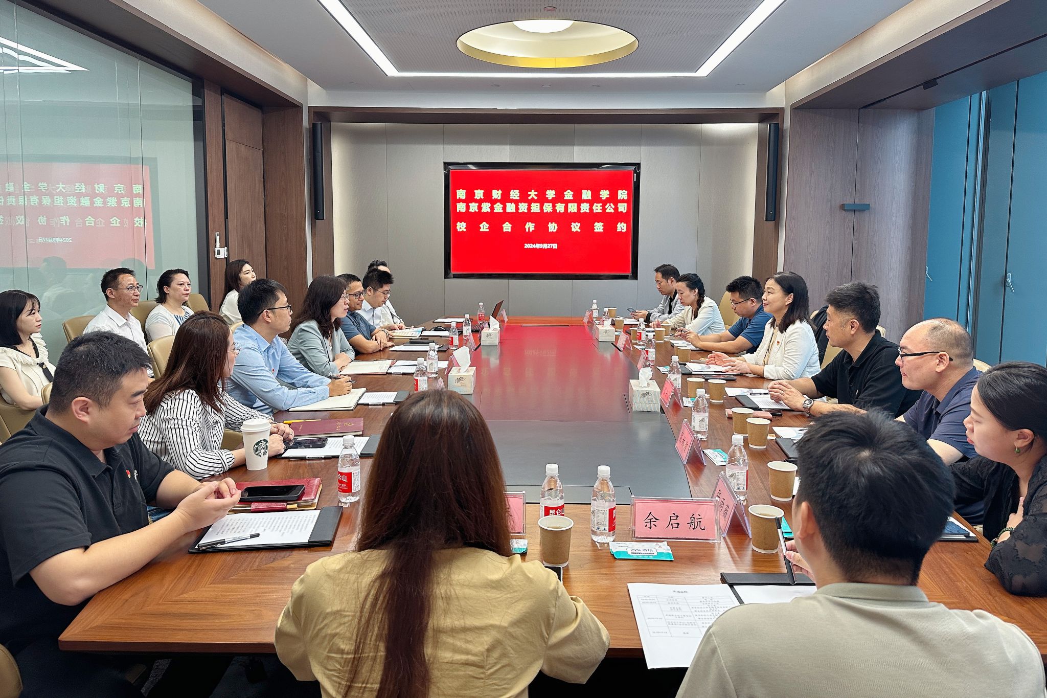 会上,资金担保公司领导介绍了紫金担保在业务发展、创新产品以及发展战略方面的最新动态,希望与学院在人才培养、课题研究等方面展开深入合作,公司将充分发挥资源优势为学院师生提供良好的实践、科研、创新等平台。孙菲书记高度赞扬了紫金担保为服务实体经济高质量发展作出的贡献,希望校企双方进一步深化合作内涵,共同谱写校企合作新篇章,共同提升金融为经济社会发展提供高质量服务的水平。双方共同签署了研究生工作站合作协议和共建就业实习基地协议。