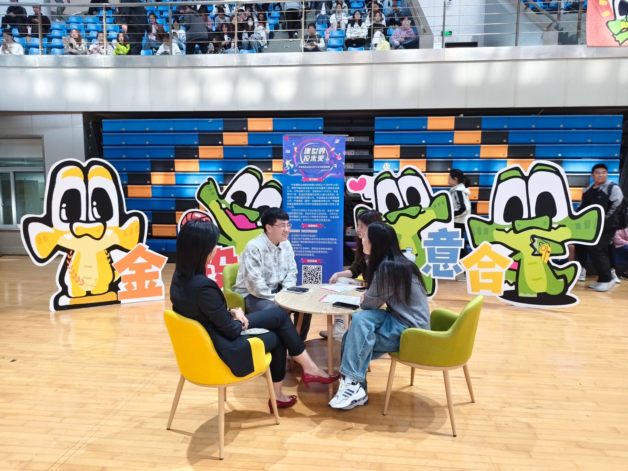 活动现场还开展了“球探式招聘”,创新打造“竞技+求职”双赛道,每队由3名学生与2名企业员工混编组队,通过投行、资管、风控三大身份卡实战考验专业应变能力。决赛环节同步开放量化交易模拟盘操作,得分王可直接进入中信建投证券终面;观众席特设“招聘加油站”,扫码即可投递简历,“我们要找的就是这种抗压能打、懂规则创新的‘α型选手’。”中信建投江苏分公司人力资源负责人于女士表示,这种沉浸式互动让我们发现了传统面试中难以捕捉的“三分球准、β系数稳”复合型人才。