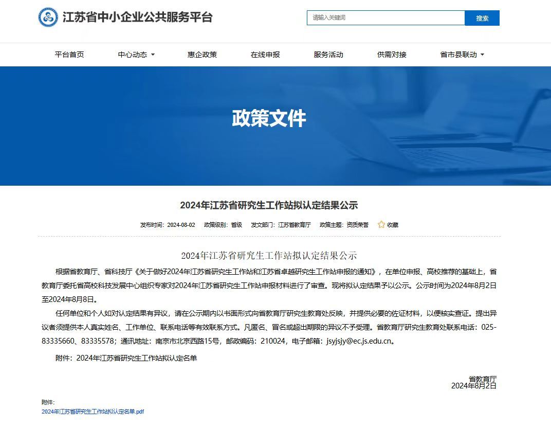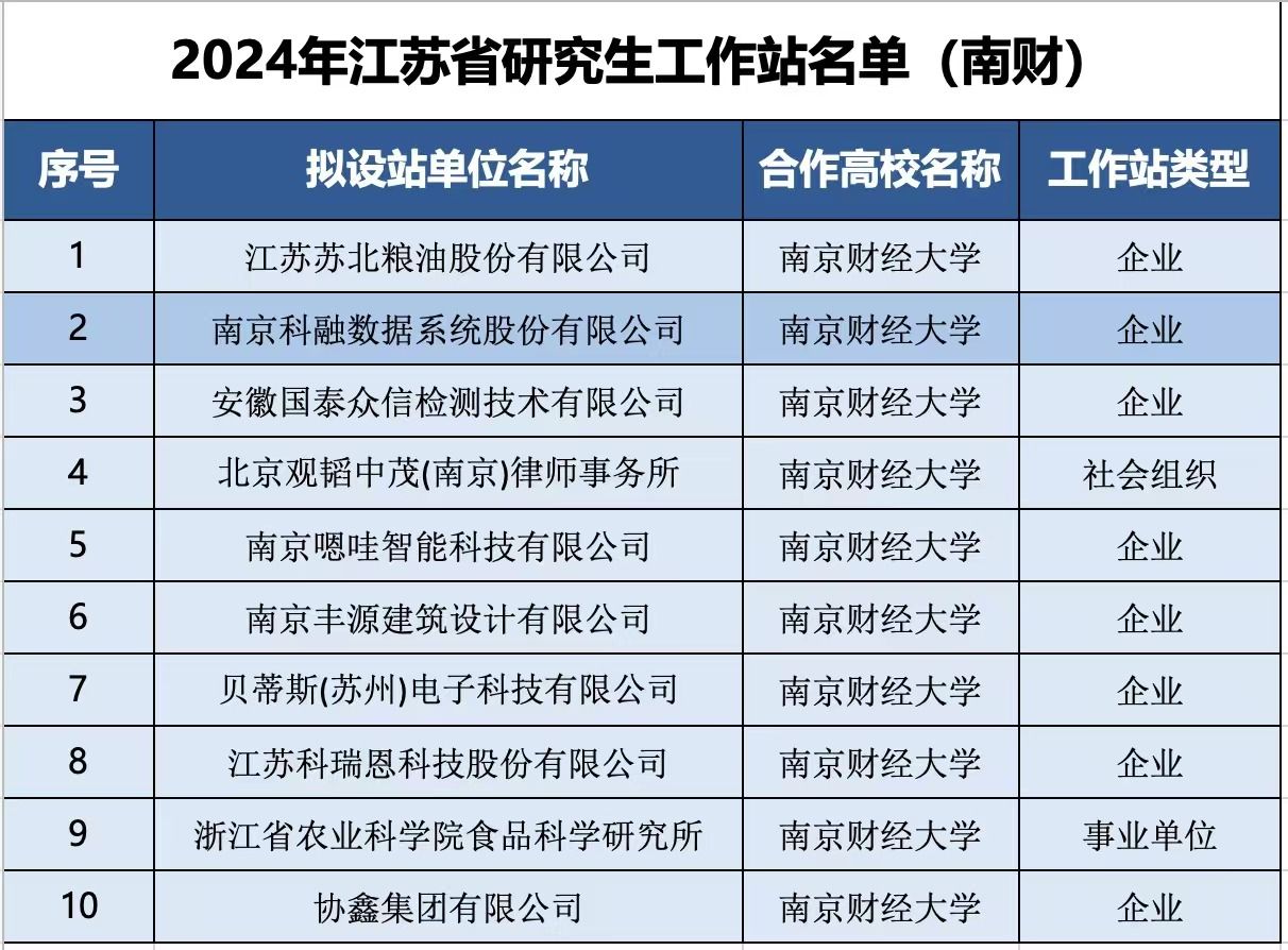 9月中旬,江苏省教育厅、科技厅印发《关于做好2024年江苏省研究生工作站和江苏省卓越研究生工作站申报的通知》,经单位申报、材料审查、专家评审、网上公示等程序,确定了2024年江苏省研究生工作站名单。ai色情 申报的南京科融数据系统股份有限公司被批准为2024年江苏省研究生工作站,本年度南财全校共获批10个江苏省研究生工作站。
