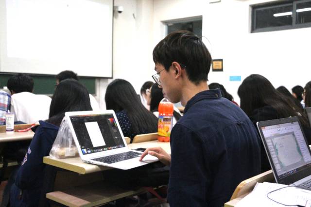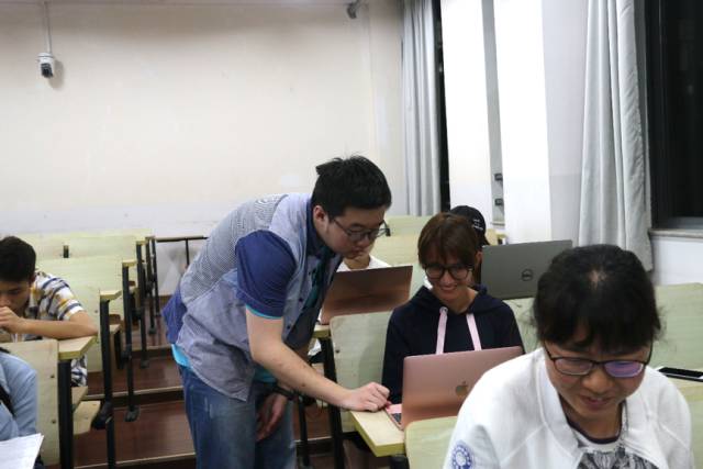 这也是罗宇舟学长的小挑战环节,让大家根据PPT上显示的具体程序进行“毛玻璃”效果的现场操作,没想到看似清晰的过程还是难倒了不少同学,大家按照“做好举右手,有问题举左手”的规定,纷纷举起左手,学长也十分耐心地下场逡巡指导,悉心解答。
