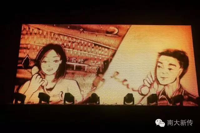 沙画表演《爱是一棵树》讲述了父亲突患白血病、学院组织师生进行募捐的故事。小时候父亲的肩膀是最温暖的依靠,十八岁离家父亲是最坚实的树洞——父亲如同一棵树,而师生之情、同窗之谊也正如一棵大树。大屏幕上的沙画变换着形状,勾勒出一幅幅感人至深的画面。