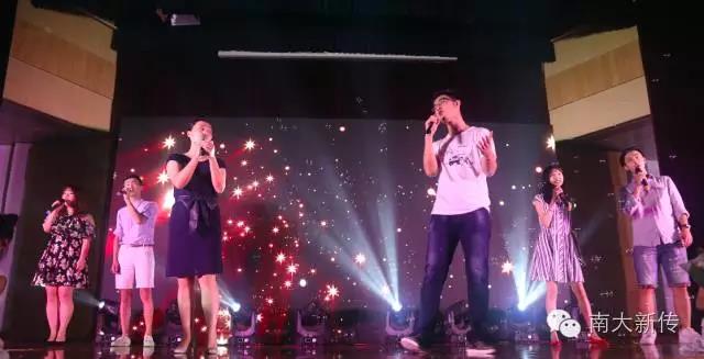 沙画表演结束,温暖还在继续。新传一众男神女神老师带领研究生们为大家演唱《相亲相爱一家人》,朴实而熟悉的旋律宛如电影胶片,将往事一幕幕拉回了眼前。台上老师们青春依旧,光彩动人,与学生亲密互动,更有身着白色小纱裙的女孩在台前伴舞,萌点泪点化为阵阵掌声和欢呼。