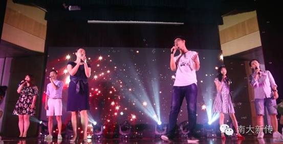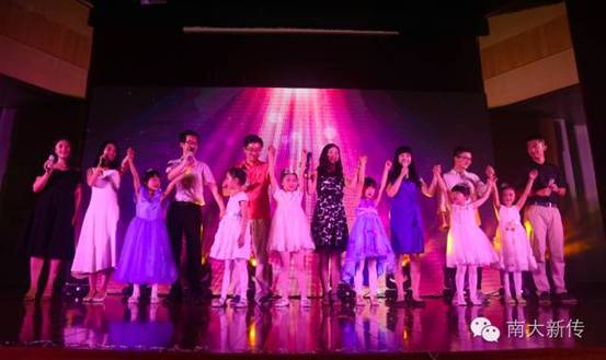 沙画表演结束,温暖还在继续。新传一众男神女神老师带领研究生们为大家演唱《相亲相爱一家人》,朴实而熟悉的旋律宛如电影胶片,将往事一幕幕拉回了眼前。台上老师们青春依旧,光彩动人,与学生亲密互动,更有身着白色小纱裙的女孩在台前伴舞,萌点泪点化为阵阵掌声和欢呼。 4