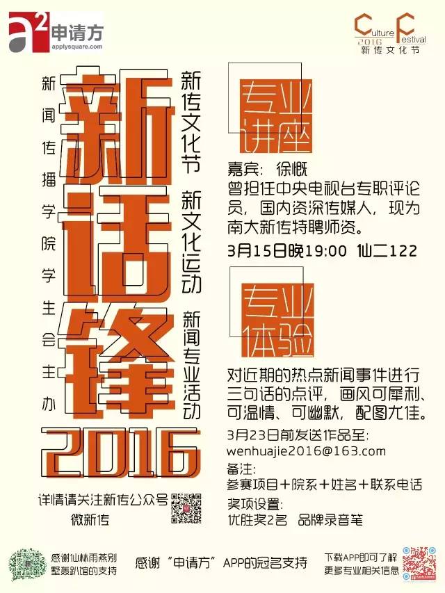 3月5日雷锋日,3月15是什么日子?如果你说是消费者权益保护日,不好意思,你只回答对了一半,明天,是“新·话锋”新闻专业讲座开始的日子!我们将给你带来一场颠覆你传统观念的新闻专业讲座-----“新闻背后的新闻”,听到主题名,你是不是就已经浮想联翩,好奇不已了呢?此次特邀嘉宾,徐慨,中央电视台原专职评论员,资深传媒人,现任南大新传特聘师资, 很多人称赞他言语犀利有洞察,思想高远有深度,只需明晚两个小时,你便可以一睹他的风采,跟他一起打开一扇绮丽的大门,了解新闻背后的世界。重要的事说3遍,就在明晚,就在明晚,就在明晚哦!