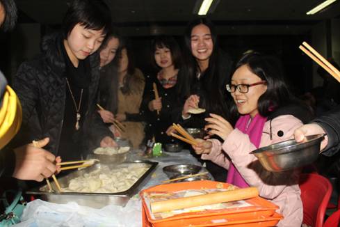 在包完饺子后,物院和新传的姑娘小伙们便开始了饺子大宴。同学们边吃着千奇百怪的饺子,便猜想着包饺子的人,并共话着不同地方的冬至习俗,好不热闹。