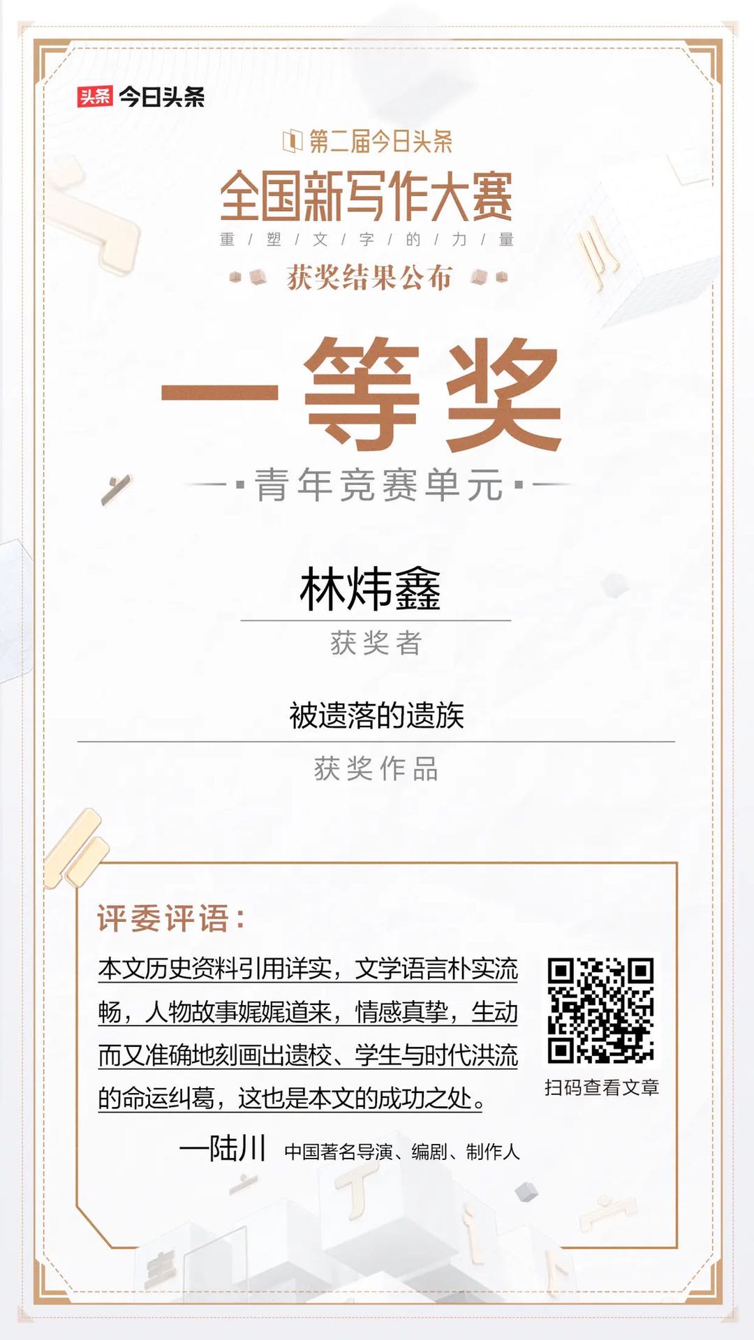 本次大赛从6月22日启动征稿,历时3个多月,共收到了237578篇投稿,文章总阅读量达7.23亿,活动全网曝光量达10.67亿。经过大赛组委会的评议,25位获奖者从众多参赛作者中脱颖而出,获得大赛单元大奖及单项奖。