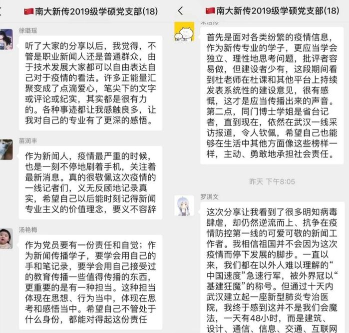 2019级学硕党支部书记丁安一认为,每位党员应该充分发挥先锋模范作用,积极配合学校、学院的疫情防控布置,为打赢疫情防控攻坚战尽职尽责;前辈党员新闻人和无数“逆行者”给了大家榜样力量,要体现新时代党员青年的力量和作为,为人民和时代发声发力。