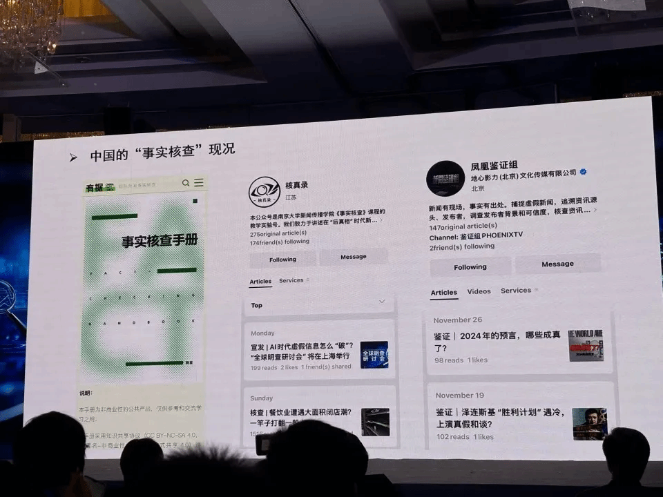 值得注意的是,在会议伊始的主旨演讲环节,复旦大学特聘教授张力奋谈及中国的事实核查现况,特别提到了“核真录”作为校园媒体、在事实核查工作上的重要性及成果。