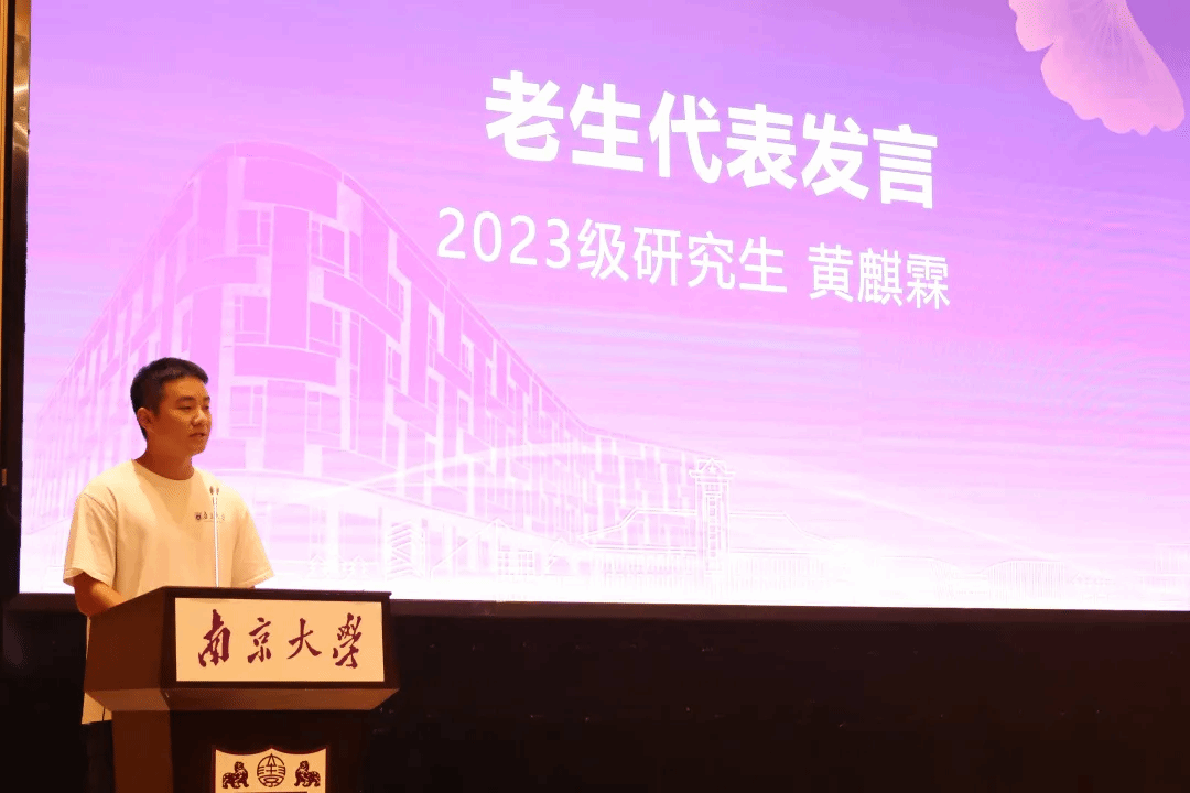 2019级本科毕业生、2023级在读硕士研究生黄麒霖同学代表老生发言,他回顾了自己五年来在南大新传的成长经历。他相信,依托“学院即媒体”的教学理念和丰厚的学术资源,大家在新闻实务或学术研究上都能学有所成。他还分享了看到“附近”、洞察“远方”、定位“自我”的成长感悟,鼓励大家扎根时代的田野,把调查研究和学术论文写在祖国大地,耕耘出自洽的花园。
