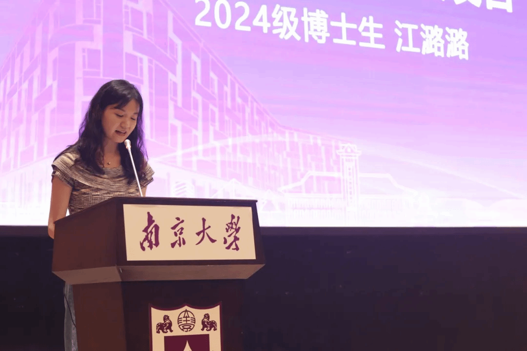 2024级博士生江潞潞代表研究生新生发言。她回顾了硕士阶段在南大新传的学习时光。她以“享受”、“交流”和“希望”三个关键词和同学们共勉。成长是一种长期主义,通过实实在在的努力可以开发出对自我的认定,并在参与学科建设的点滴实践中,戒掉小情绪,清晰大方向,珍惜正导向,感受空前的清澈。凭借“南大人”的善良、行动和“嚼得菜根”的韧劲儿,收获一片灿烂的天空。