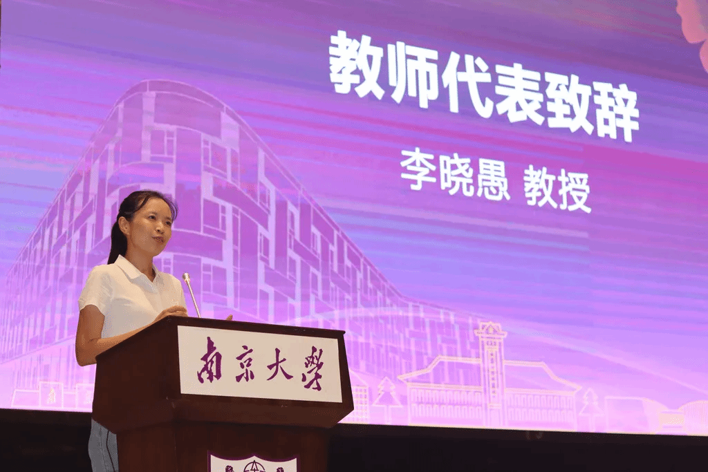 教师代表、副院长李晓愚教授致辞,祝贺同学们迈入人生新旅程,成为了一名南大新传人。从“年年岁岁花相似,岁岁年年人不同”说起,她与同学们交流了“什么是成长”这一核心问题。以自己的奋斗体会为例,她激励新生不断积淀自我,锻造成才、成功的过硬本领,享受成长过程的纯粹快乐。同时,她希望大家在南大这所综合性大学“永远保持探索的好奇心”,积累多元化的思维工具,从容应对世界。此外,也要坚持独立思考和判断,追求真理,把失败转变为成长的动力。最后,李晓愚祝福大家在和时光赛跑的过程中,可以有“苟日新,日日新,又日新”的变化和成长。