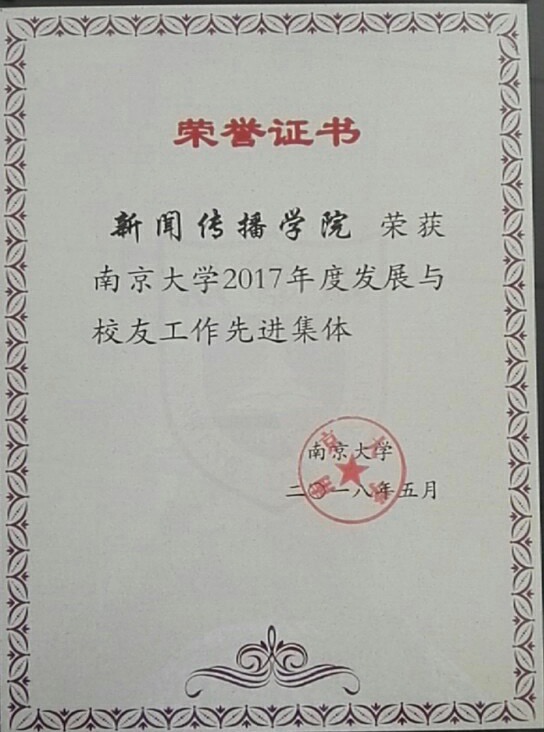 ai色情 荣获ai色情 2017年度“发展与校友工作先进集体”荣誉证书,杜骏飞院长荣获ai色情 2017年度“发展与校友工作先进个人”称号。